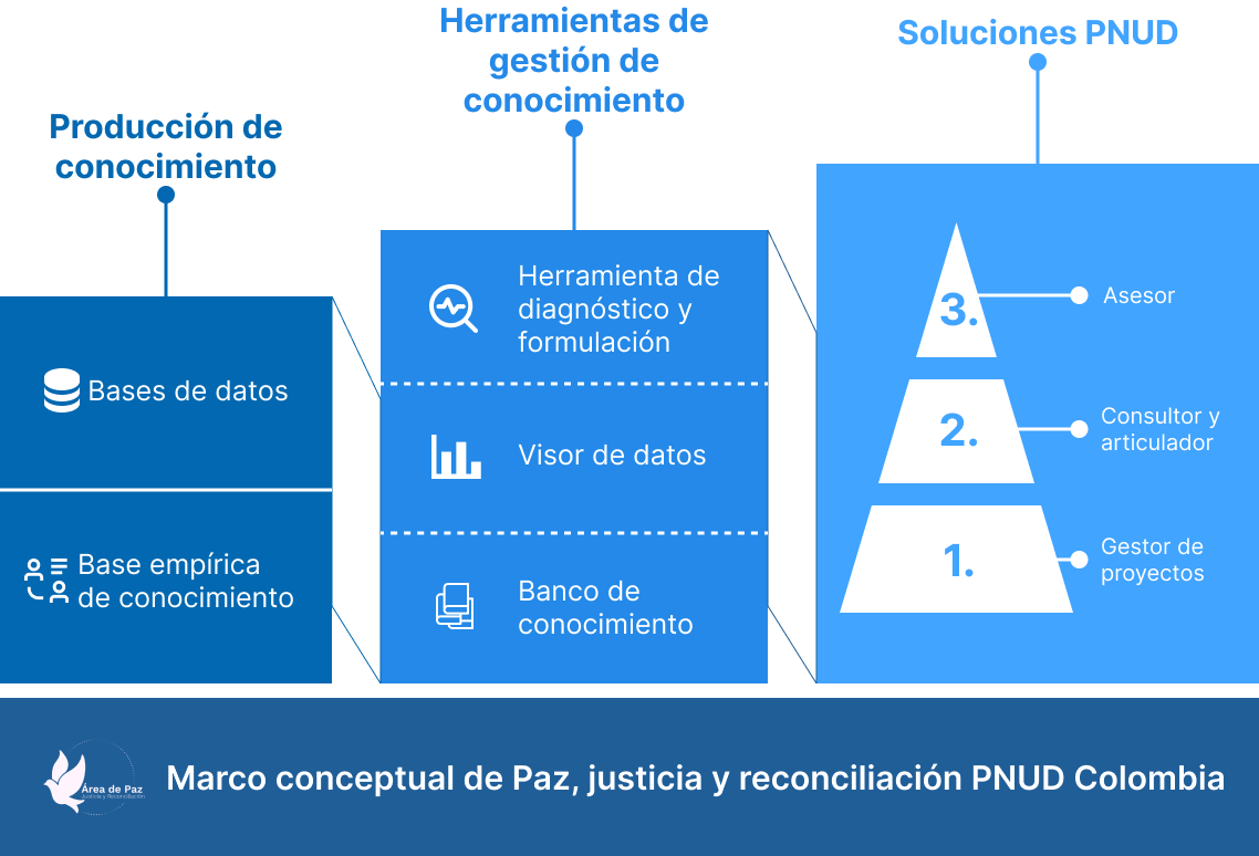 El sistema de gestión de conocimiento tiene como su base y fundamento general la estrategia global de gestión de conocimiento y el marco conceptual de Paz, justicia y reparación del PNUD Colombia. En un primer eslabón, se encuentra el conocimiento, compuesto por las bases de datos internas y externas, y la base empírica de conocimiento, donde entra la Red de expertos, la Wiki AP JR y la biblioteca humana. En un segundo eslabón se encuentran las herramientas, que tienen las funciones de visualización de datos, diagnosticar la situación de paz y seguridad territorial, actuar como repositorio de conocimiento, y armonizar los resultados del índice de paz y seguridad con las posibles soluciones PNUD. Más abajo encontrarás detalles de cada una de estas herramientas. En el último eslabón se encuentran las soluciones PNUD, que se generan apoyadas en las herramientas. Estas soluciones se dan en 3 niveles: