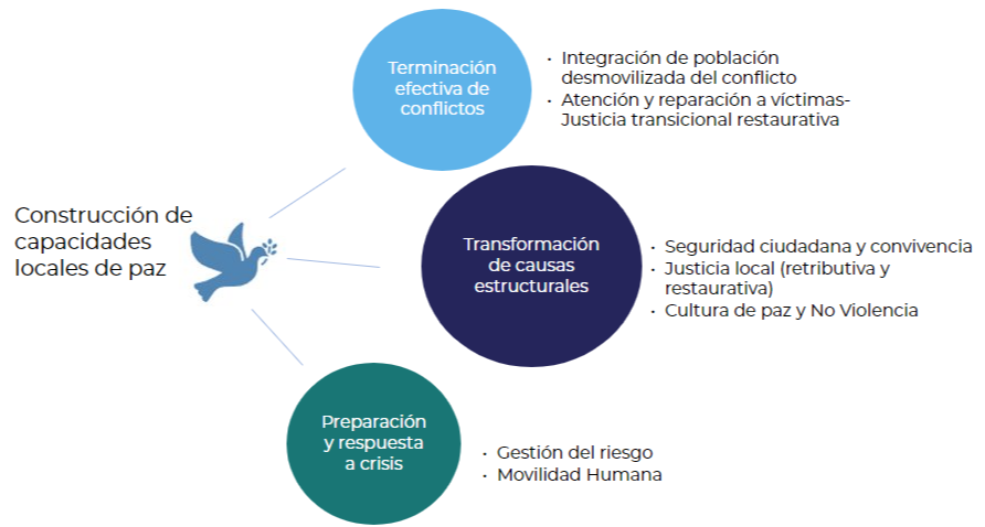 A partir de lo anterior, el área de Paz, Justicia y Reconciliación entiende que la construcción de capacidades locales de paz se debe hacer en 3 ejes: